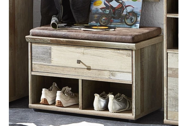 Předsíňová lavice/botník s polstrovaným sedákem ze stylové kolekce Bonanza – povrchy imitující vintage optiku oprýskaných dřevěných latí vnesou do vašeho interieru originalitu a zároveň inspiraci k zařízení opravdu stylového bytu. Prakticky poslouží při každoddenním obouvání.