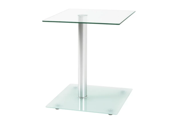 Praktický přístavný stolek o čtvercovém půdorysu je vyroben z kovu, čirého skla a mléčného skla. Poslouží pro praktické odkládání předmětů (např. odkládání věcí vedle sedačky, na lampičku, vázu, dekorace nebo třeba umístění uměleckých předmětů).