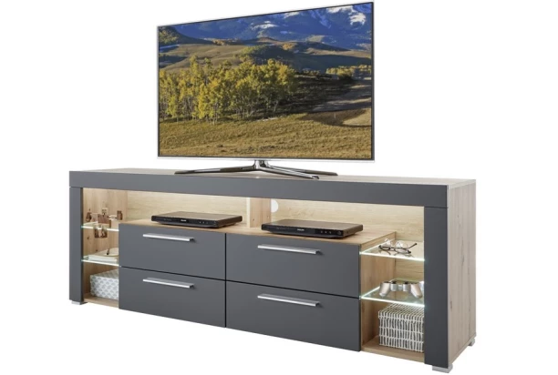 TV stolek v moderním stylu a o celkové šířce 179 cm, vyroben v kombinaci dub artisan/šedý vysoký lesk. Obsahuje úložné zásuvky, otevřené přihrádky i skleněné police s působivým LED osvětlením.