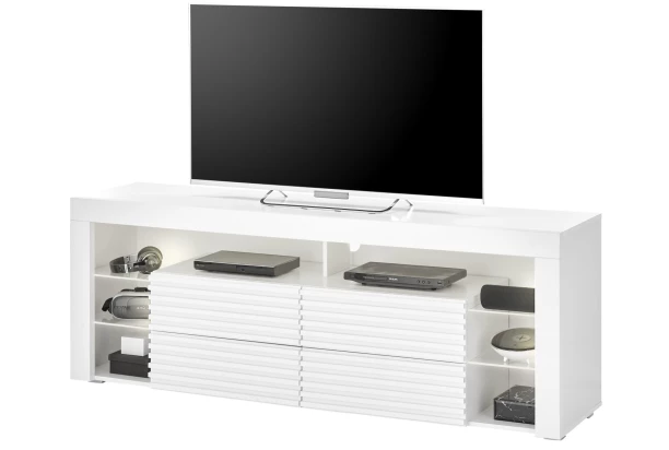 TV stolek v moderním stylu o celkové šířce 179 cm má optiku širokých rámů a jeho přední plochy doplňují dekorační lamely. Vyroben v bílé barvě. Obsahuje úložné zásuvky, otevřené přihrádky i skleněné police s působivým LED osvětlením, které dotváří příjemnou večerní atmosféru.