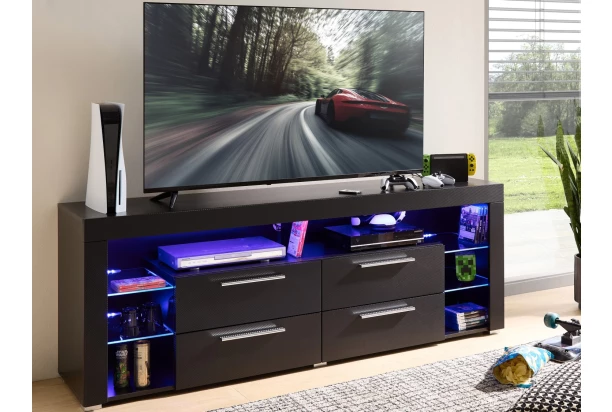 TV stolek v moderním stylu o celkové šířce 179 cm má optiku širokých rámů. Obsahuje zásuvky, otevřené přihrádky i skleněné police s působivým LED osvětlením. Vyroben v kombinaci černá mat s předními plochami v se zajímavým leskle černým vzorem.