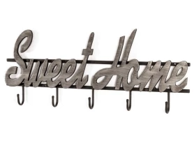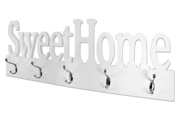 Nástěnný věšákový panel v bílém provedení s oblíbeným motivem Sweet Home zútulní atmosféru domova. Obsahuje 5 kovových dvojitých háčku pro jakékoliv věšení šatů, tašek, ručníků i utěrek.
