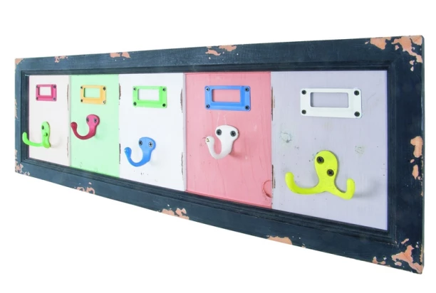 Extravagantní nástěnný šatní panel ze dřeva obsahuje 5 kovových háčků a vtipné jmenovky. Barevné plochy se záměrnou vintage optikou jsou trendy a dokonale doplní interier v mladistvě zařízeném stylu.