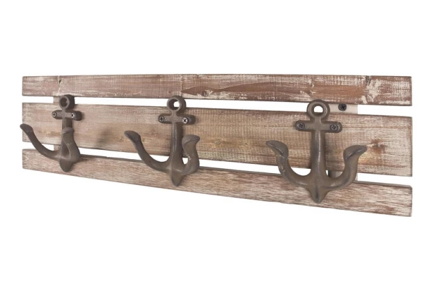 Originální nástěnný věšákový panel v námořnickém vintage stylu. Tři kovové kotvy slouží jako závěsné háčky. Skvěle tak doplní stylově zařízený byt.