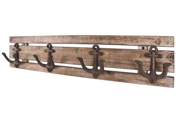 Originální nástěnný věšákový panel v námořnickém vintage stylu. Čtyři kovové kotvy slouží jako závěsné háčky. Skvěle tak doplní stylově zařízený byt.