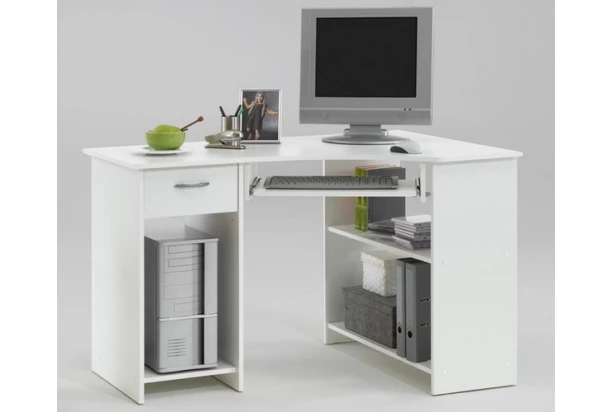Rohový PC stůl má vše potřebné k běžné práci u počítače. Vyroben v bílé barvě.