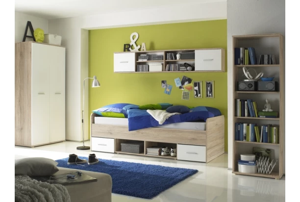 Kompletní univerzální sestava nábytku nejen pro dětský pokoj, ale i pro dospělé či seniory. Světlé sladění dubového dekoru dřeva s bílou barvou je univerzálně použitelné jak pro chlapce, tak pro dívky.