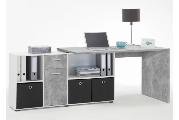 Velmi praktický psací stůl s bočním úložným regálem pasuje téměř do každé místnosti. Tento stůl nabízí možnost univerzálního sestavení do čtyř různých poloh – snadno si tak přizpůsobíte pracovní prostor podle vlastních představ anebo bytové dispozice. Psací stůl je vyroben v kombinaci imitace šedý beton/bílá. Přihrádky regálu můžete snadno doplnit úložnými boxy nebo šanony, kam si budete vše přehledně ukládat.