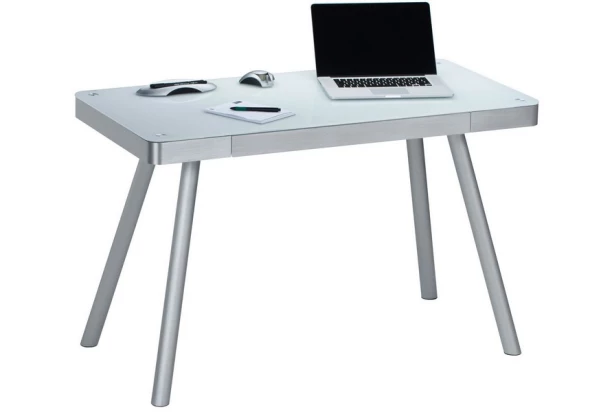 Stylový psací stůl se zaoblenými hranami v kombinaci kovu a bílého skla – je ideální také pro práci na notebooku, který pak snadno můžete uschovat do zabudované zásuvky.