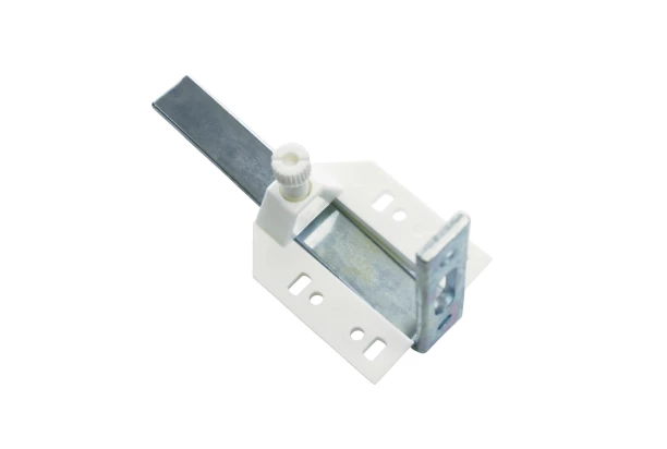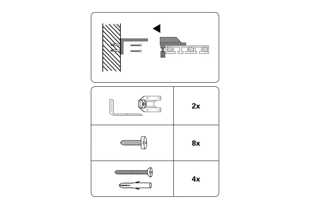 úhlový nosník (2 ks) s plastovým můstkem a 90° kovovým úhelníkem k montáži záclonových kolejniček na stěnu.