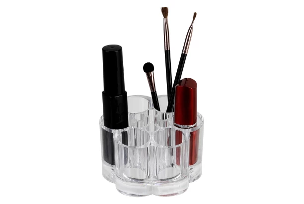 Průhledný kulatý kosmetický organizér je vybaven 12 přihrádkami, do kterých lze uložit různé kosmetické pomůcky, jako jsou např. štětce, rtěnky nebo tužky. Organizér má průměr cca 9 cm a je vysoký cca 6 cm.