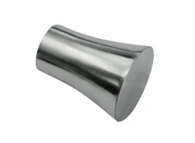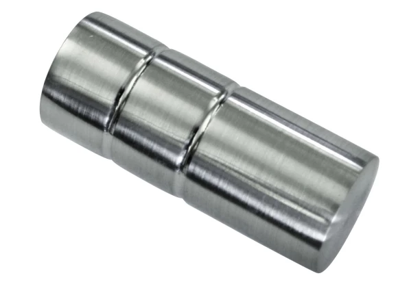 Lesklá kovová koncovka na garnýž ve tvaru válce o průměru 1,9 cm.