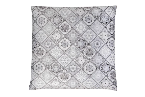 Dekorační polštář o rozměru 45×45 cm v šedé barvě se stane skutečným poutačem. Fascinující vzor v podobě orientálních květinových mandal si zamilujete.