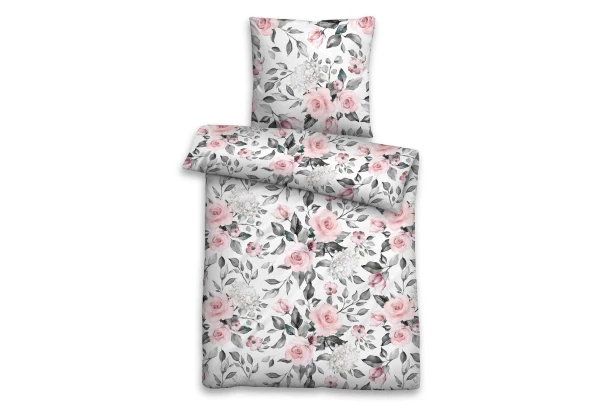 Povlečení z kvalitního bavlněného saténu v šedé barvě s elegantním motivem růžových květin rozzáří každou ložnici. Toto povlečení patří ke špičkovým výrobkům, látka je měkká, hladká a prodyšná.