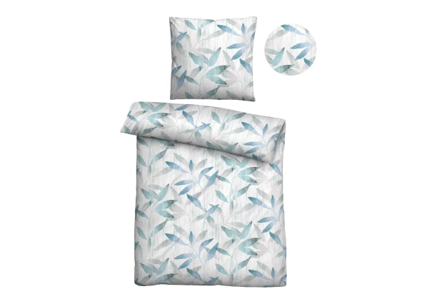 Mikrosaténové povlečení se vzorem modrých lístků je příjemné na dotek, a proto všem zajistí pohodlný spánek.