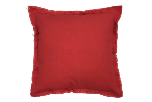 Dekorační červený polštář s okrasným lemem snadno zapadne do každého interiéru. Rozměr 42×42 cm.