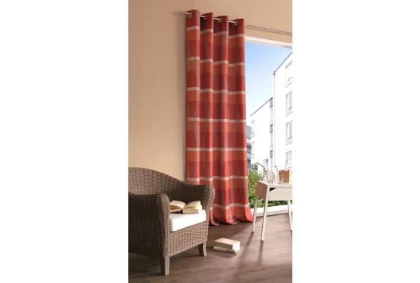 Neprůhledný červený závěs o rozměru 146×245 cm vyniká krásnou kombinací vodorovných pruhů, které jsou přerušeny jemným vlnitým motivem. Vše je harmonicky sladěno a závěs tak působí klidně a elegantně.
