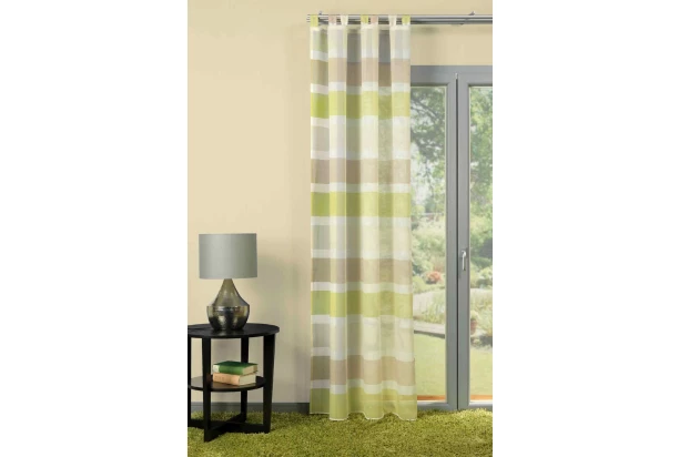 Poloprůhledný zelený závěs s pruhy navodí uvnitř místnosti příjemný pocit pohody. Rozměr 140×245 cm.