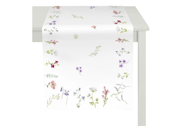 Oživte svůj stůl elegantním běhounem, který na rozdíl od ubrusu zakryje jen prostřední část stolové desky. Bílý běhoun s motivem lučních květin je nejen krásný, ale také poskytne částečnou ochranu před poškrábáním. Rozměr 40×150 cm.