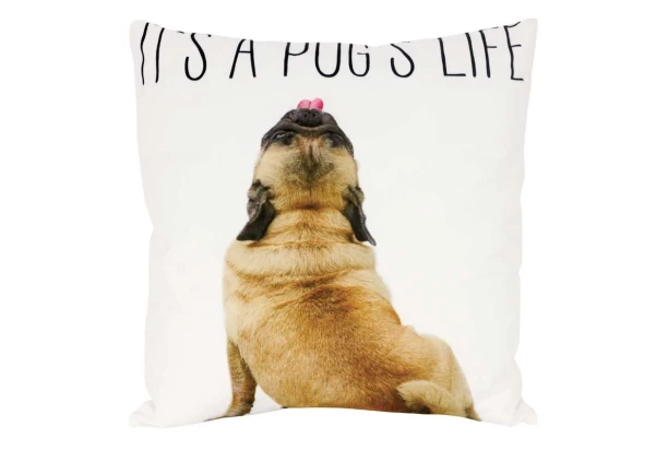 Dekorační polštář s výplní a dekorem mopsíka oživí nejen obývací pokoj, ale i ložnici nebo dětský pokoj. Motiv i anglický text „It's a pug's life“ si oblíbí každý majitel tohoto pejska. Rozměr 45×45 cm.
