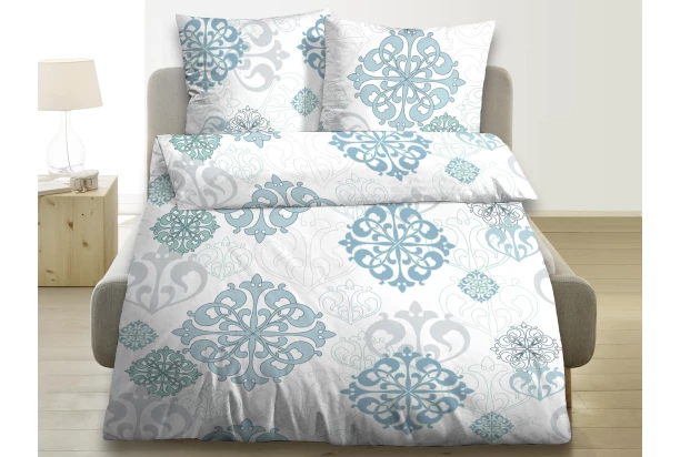 Moderní ložní povlečení z jemného bavlněného saténu v atraktivním designu s ornamenty v modro-šedé barvě zaujme na první pohled a v ložnici navodí příjemný pocit pohody.