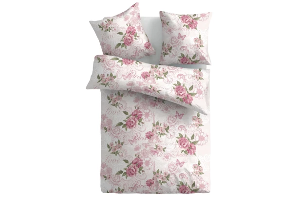 Elegantní povlečení s květinovým vzorem růží, Paříží a romantickými nápisy je vyrobeno z bavlny renforcé, která je špičkou v bavlněném textilu. Je jemnější, hebčí a příjemnější na dotek, navíc má zvýšené absorpční vlastnosti, odvádí vlhkost, je odolnější vůči otěru a má delší živostnost. Rozměr 140×200 cm.