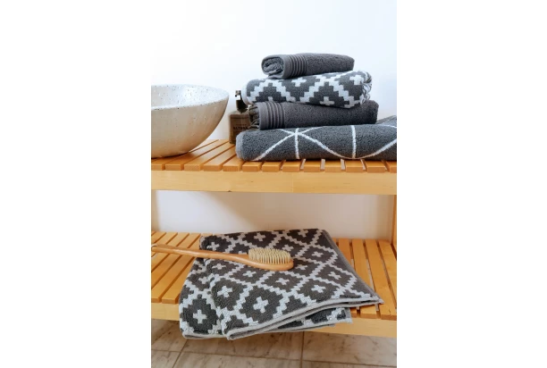 Osuška o rozměru 67×140 cm v antracitové barvě z moderní kolekce Graphics Raute v designu skandinávského grafického vzoru ve tvaru kosočtverců je utkána z velice jemného zwirn-froté o gramáži 500g/m² technologií Jacquard. Mimořádně savá a hebká osuška je vyrobena z bavlny a působí robustním dojmem.