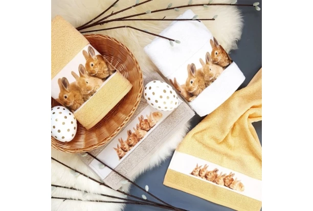Dětskou osušku s roztomilým zvířecím motivem ve žluté barvě si zamilují holky i kluci. Dětská osuška s barevným fotopotiskem králíčků v úzkém bílém pruhu je vyrobena z bavlny a je utkána do jemného Walk-froté o gramáži 410g/m². Rozměr 75×150 cm.