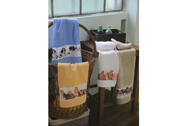 Dětskou osušku s roztomilým zvířecím motivem ve žluté barvě si zamilují holky i kluci. Dětská osuška s barevným fotopotiskem koťat v úzkém bílém pruhu je vyrobena z bavlny a je utkána do jemného Walk-froté o gramáži 410g/m². Rozměr 75×150 cm.