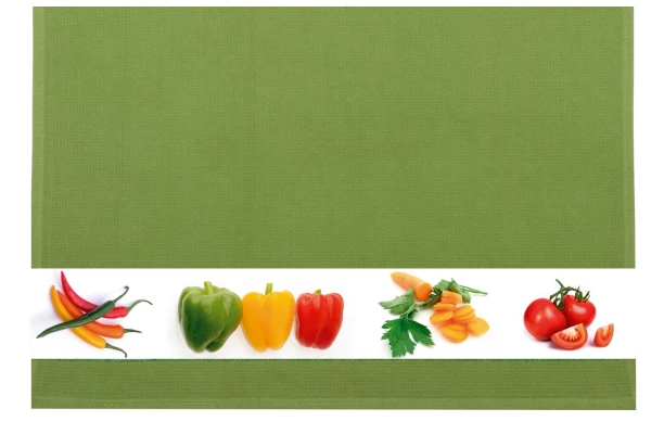 Kuchyňská utěrka v mechově zeleném provedení s barevným úzkým potiskem zeleniny se stane perfektním doplňkem moderní kuchyně. Utěrka je vyrobena z bavlněné vaflové látky s charakteristickým kostičkovaným vzorem o gramáži 330g/m². Materiál oceníte pro jeho savost a měkkost. Rozměr 50×70 cm.