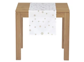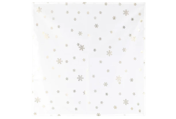 Elegantní bílý ubrus na stůl se zimním motivem zlatých sněhových vloček navodí v kuchyni či jídelně příjemnou sváteční atmosféru a pohodu nejen u štědrovečerní večeře. Ubrus je nejen krásný, ale i praktický bytový doplněk, který poskytne ochranu stolu před poškrábáním a ušpiněním. Rozměr 80×80 cm.