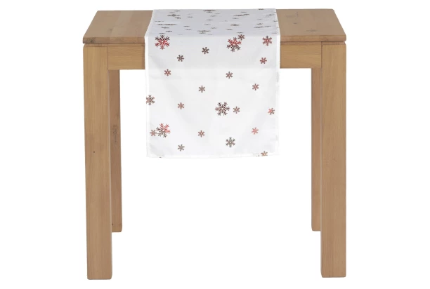 Elegantní bílý běhoun na stůl se zimním motivem červených sněhových vloček vykouzlí vánoční atmosféru a sváteční pohodu nejen u štědrovečerní večeře. Běhoun na rozdíl od ubrusu zakryje jen prostřední část stolové desky, ale i tak poskytne částečnou ochranu stolu před poškrábáním a ušpiněním. Rozměr 150×40 cm.