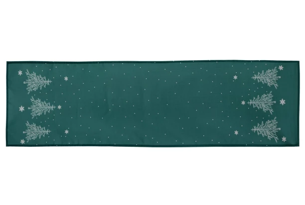 Elegantní zelený běhoun na stůl s motivem bílých stromků a sněhových vloček vykouzlí vánoční atmosféru a sváteční pohodu nejen u štědrovečerní večeře. Běhoun na rozdíl od ubrusu zakryje jen prostřední část stolové desky, ale i tak poskytne částečnou ochranu stolu před poškrábáním a ušpiněním. Rozměr 40×150 cm.