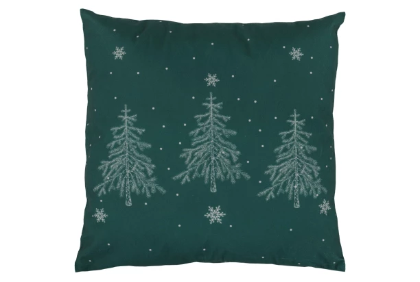 Dekorační polštář z příjemného sametu je hladký a měkký na dotek. Polštář s vánočním dekorem bílých stromků a sněhových vloček na zeleném podkladu poskytne pohodlí a dokonale ozdobí Váš domov během Vánoc. Rozměr 45×45 cm.