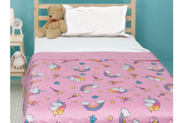 Dětský přehoz na postel o rozměru 170×210 cm s roztomilými jednorožci a barevnými duhami na růžovém podkladu potěší všechny malé slečny a skvěle oživí jejich pokojíček.