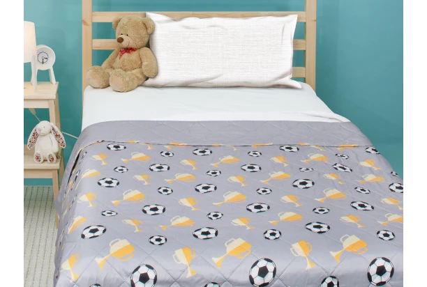 Dětský přehoz na postel o rozměru 170×210 cm s fotbalovým motivem na šedém podkladu perfektně doladí pokoj malých i velkých nadšenců do fotbalu.