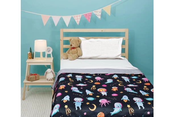 Dětský přehoz na postel o rozměru 170×210 cm s motivem roztomilých zvířátek ve vesmíru na černém podkladu perfektně doladí holčičí i klučičí pokojíček.