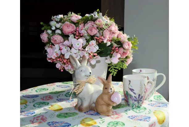 Bílý ubrus na stůl s motivem velikonočních kraslic vykouzlí sváteční atmosféru v každé domácnosti. Ubrus je nejen krásný, ale i praktický bytový doplněk, který poskytne ochranu stolu před poškrábáním a ušpiněním. Rozměr 160×130 cm.