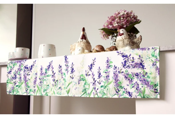 Běhoun na stůl s levandulovým motivem vnese do Vašeho domova jarní náladu a pohodu. Běhoun na rozdíl od ubrusu zakryje jen prostřední část stolové desky, ale i tak poskytne částečnou ochranu stolu před poškrábáním a ušpiněním. Rozměr 150×40 cm.