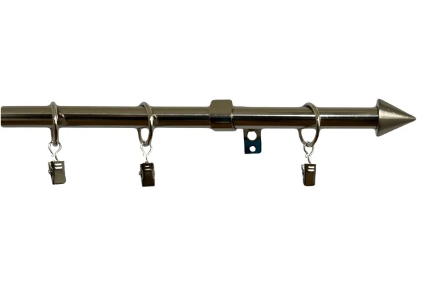 Záclonová souprava o délce 240 cm a průměru 16 mm je vyrobena z ušlechtilé oceli. Balení obsahuje tyč, koncovky, nosníky, kroužky s kovovými žabkami a montážní materiál.