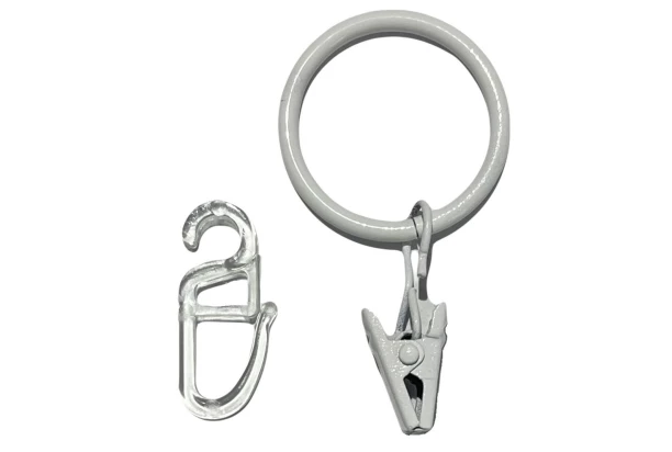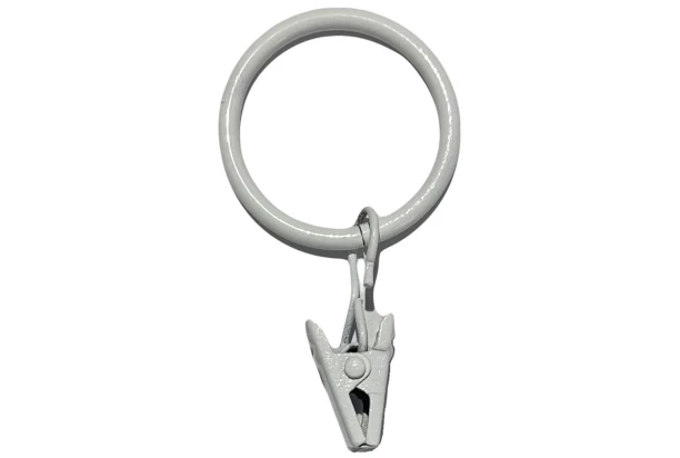 Sada (10 ks) kroužků na garnýž se žabkou a zavíracím háčkem v bílé lesklé barvě. Určeno pro záclonové tyče o průměru 16 – 20 mm.