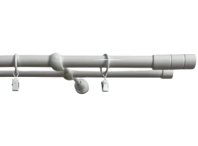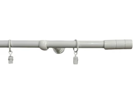 Kovová garnýž v bílé lesklé barvě s délkou 160 cm a válcovou koncovkou. Kroužky se žabkou, nosníky a montážní materiál jsou součástí dodávky.