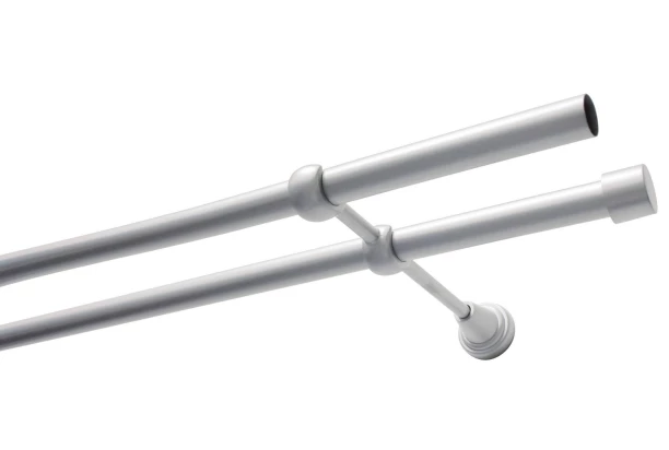 Dvojitá záclonová souprava obsahuje dvě kovové tyče a válcové koncovky v provedení stříbrný satén. Délka 240 cm, průměr 19 mm.