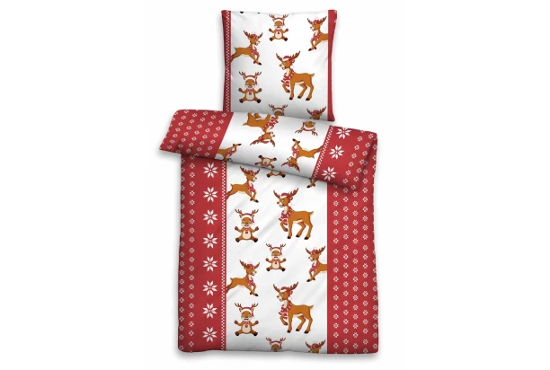 Hřejivé vánoční povlečení z měkkého biberu s veselými motivy sobů v červeno-bílém provedení přinese do dětského pokoje kouzelnou sváteční atmosféru. Ideální pro zimní měsíce.