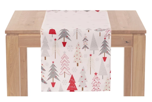 Bílý běhoun na stůl se zimním motivem stromků vykouzlí vánoční atmosféru a sváteční pohodu nejen u štědrovečerní večeře. Běhoun na rozdíl od ubrusu zakryje jen prostřední část stolové desky, ale i tak poskytne částečnou ochranu stolu před poškrábáním a ušpiněním. Rozměr 150×40 cm.