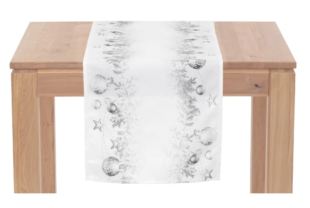 Bílý běhoun na stůl s motivem vánočních koulí vykouzlí sváteční atmosféru a zimní pohodu nejen u štědrovečerní večeře. Běhoun na rozdíl od ubrusu zakryje jen prostřední část stolové desky, ale i tak poskytne částečnou ochranu stolu před poškrábáním a ušpiněním. Rozměr 150×40 cm.