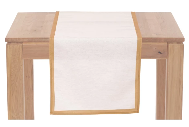 Krémový běhoun na stůl s vetkanými zlatými nitkami a zlatým lemem vykouzlí sváteční atmosféru a zimní pohodu nejen u štědrovečerní večeře. Běhoun na rozdíl od ubrusu zakryje jen prostřední část stolové desky, ale i tak poskytne částečnou ochranu stolu před poškrábáním a ušpiněním. Rozměr 150×40 cm.