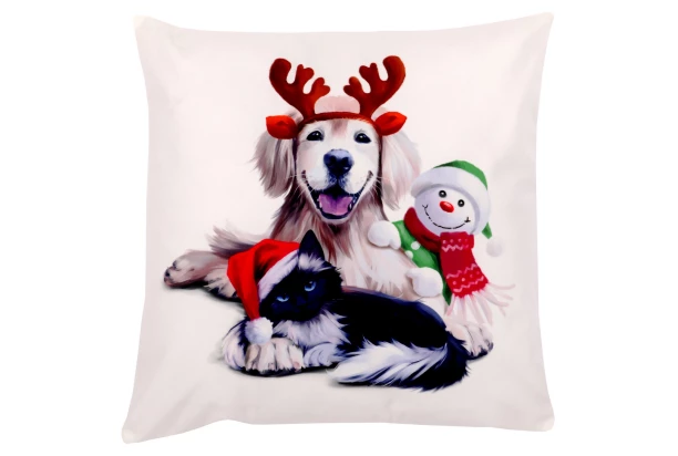 Dekorační povlak na polštář o rozměru 45×45 cm je ideální pro standardní polštáře. Povlak je vyroben z polyesteru, který má vzhled sametu, a proto je jeho povrch hebký na dotek. Zimní vánoční motiv psa se sobími parohy, kočky s čepicí a sněhuláka vnese do každého interiéru sváteční atmosféru a veselou náladu.