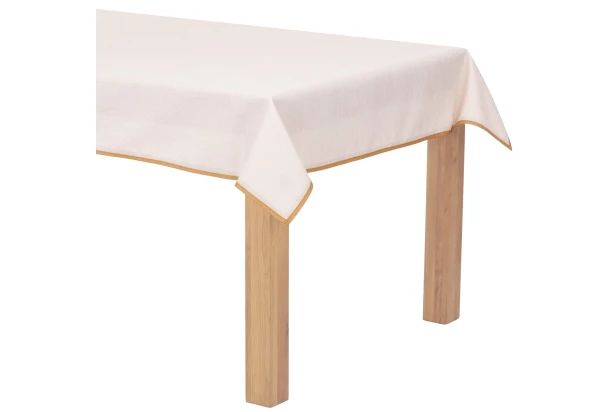 Ubrus na stůl v krémové barvě s vetkanými zlatými nitkami a zlatým lemem navodí v kuchyni či jídelně příjemnou sváteční atmosféru a pohodu. Ubrus je nejen krásný, ale i praktický bytový doplněk, který poskytne ochranu stolu před poškrábáním a ušpiněním. Rozměr 130×160 cm.