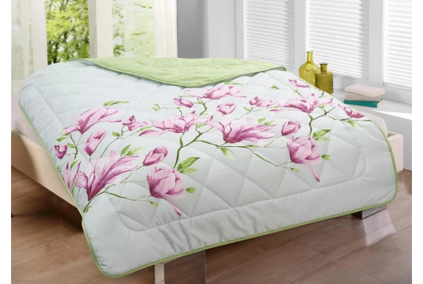 Lehká a prodyšná letní přikrývka je ideální pro pohodlný spánek během teplých nocí. Peřina má oboustranný design v bílo-zelené barvě. Přední strana má květinový vzor s magnoliemi, zadní strana je jednobarevná. Rozměr 140×200 cm.